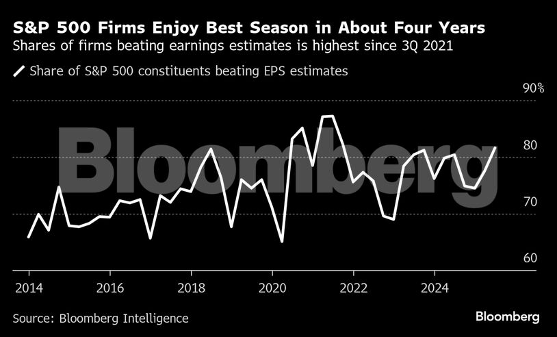 Καθώς η περίοδος ανακοινώσεων του β’ τριμήνου φτάνει στο τέλος της, τα συγκεντρωτικά κέρδη ανά μετοχή (EPS) των εταιρειών του S&P 500 εμφανίζουν αύξηση 11% σε σχέση με πέρυσι, ξεπερνώντας σημαντικά το μέσο όρο πρόβλεψης των 4%, σύμφωνα με τους αναλυτές. Με το 92% των εταιρειών να έχει ήδη ανακοινώσει αποτελέσματα, το 60% κατάφερε να ξεπεράσει τις εκτιμήσεις για τα EPS κατά περισσότερο από μία τυπική απόκλιση.