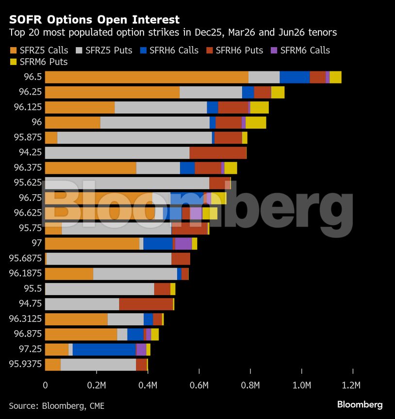 Στα SOFR options με διάρκεια Dec25, Mar26 και Jun26, η τιμή εξάσκησης 96,50 παραμένει η πιο δημοφιλής και σημείωσε έντονη δραστηριότητα την περασμένη εβδομάδα μέσω των Dec25 calls, όπου βρίσκεται πλέον το μεγαλύτερο μέρος του ανοικτού ενδιαφέροντος. Η τιμή εξάσκησης έχει χρησιμοποιηθεί εκτενώς στις πρόσφατες συναλλαγές με στόχο μειώσεις επιτοκίων κατά μισό σημείο σε μία από τις εναπομένουσες συνεδριάσεις της Fed φέτος.