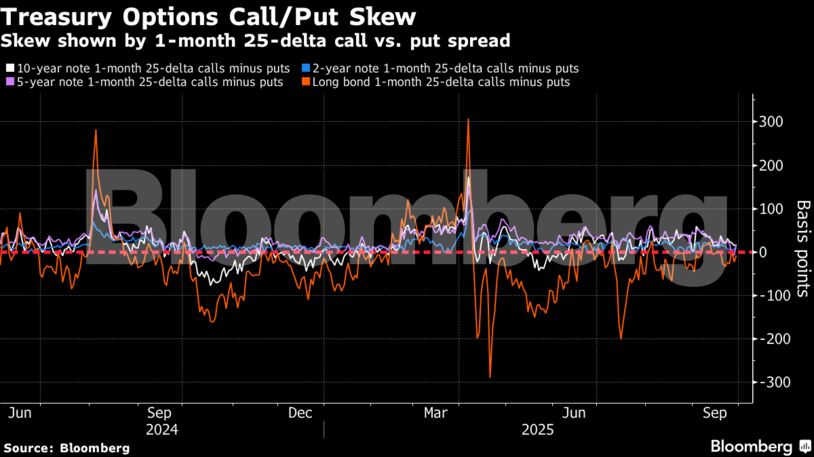 Το Treasury options skew συνεχίζει να διαπραγματεύεται σε ουδέτερα επίπεδα σε όλη την καμπύλη, με το μακροπρόθεσμο άκρο να αναστρέφεται πρόσφατα από την προτίμηση για put premium στις αρχές Σεπτεμβρίου.