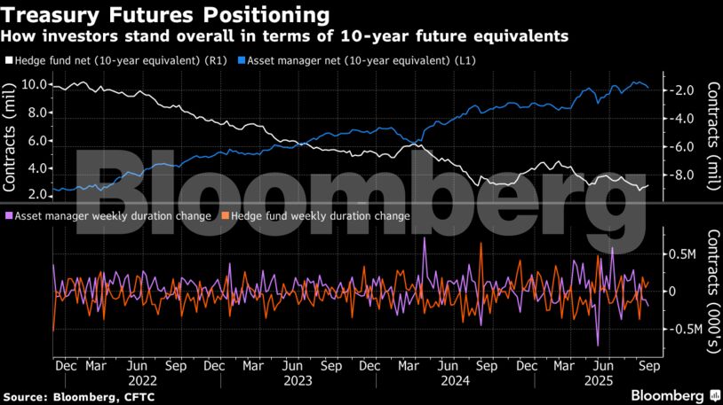 Την εβδομάδα που έληξε στις 23 Σεπτεμβρίου, οι διαχειριστές περιουσιακών στοιχείων ρευστοποίησαν τις καθαρές θετικές θέσεις σε συμβόλαια μελλοντικής εκπλήρωσης του Δημοσίου για τρίτη συνεχόμενη εβδομάδα, εκκαθαρίζοντας περίπου 200.000 συμβόλαια μελλοντικής εκπλήρωσης 10ετών ομολόγων. Σημειώθηκε μεγάλη εκκαθάριση θέσεων στα συμβόλαια μελλοντικής εκπλήρωσης SOFR, όπου οι διαχειριστές περιουσιακών στοιχείων μείωσαν τις net long θέσεις κατά 6,4 εκατ. δολάρια/DV01, ενώ τα hedge funds κάλυψαν net short θέσεις σε SOFR futures κατά 6 εκατ. δολάρια/DV01.