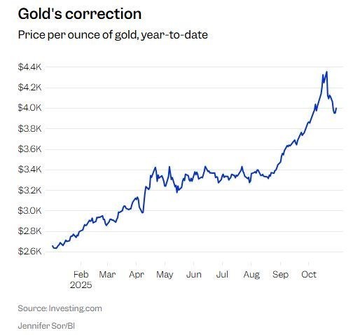 Οι τιμές του χρυσού έχουν υποχωρήσει περίπου 8% από το υψηλότερο σημείο τους, και πρόσκαιρα έπεσαν κάτω από τα 4.000 δολάρια ανά ουγγιά, αλλά παραμένουν αυξημένες κατά 50% από την αρχή του έτους, εν μέσω του ενδιαφέροντος των επενδυτών.