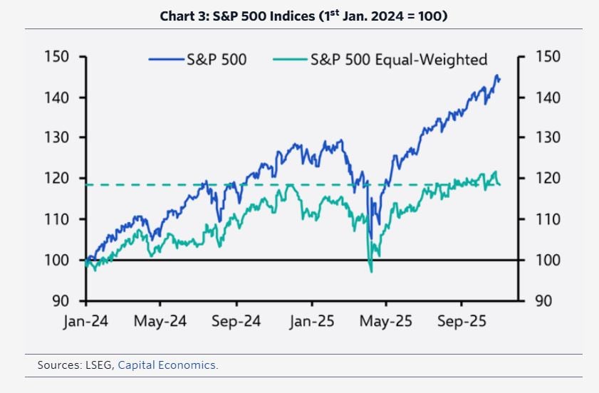 Είναι ενδεικτικό, για παράδειγμα, ότι περίπου το 12% των εταιρειών του S&P 500 βρίσκονταν την περασμένη εβδομάδα σε χαμηλά ενός έτους, την ώρα που ο δείκτης σημείωνε νέο ιστορικό ρεκόρ. Και ενώ ο S&P 500 έχει σημειώσει ράλι σχεδόν 40% από το χαμηλό της εποχής της Ημέρας Απελευθέρωσης και των δασμών, η τιμή της μετοχής της μέσης εταιρείας του δείκτη βρίσκεται γύρω στα μισά του εύρους διακύμανσης του τελευταίου έτους.