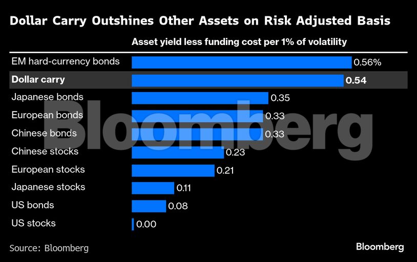 Μια απλή στρατηγική δανεισμού σε νομίσματα χαμηλής απόδοσης, όπως το ιαπωνικό γιεν ή το ελβετικό φράγκο και επένδυσης των χρημάτων σε δολάρια φαίνεται ότι θα ξεπεράσει τις υπονοούμενες αποδόσεις σε αγορές όπως οι ευρωπαϊκές μετοχές και τα κινεζικά κρατικά ομόλογα, λαμβάνοντας υπόψη τη μεταβλητότητα αυτών των περιουσιακών στοιχείων, σύμφωνα με εκτιμήσεις του Bloomberg.
