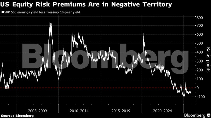 Το ασφάλιστρο κινδύνου των μετοχών των ΗΠΑ, που υπολογίζεται ως η διαφορά μεταξύ της απόδοσης των κερδών του S&P 500 και της απόδοσης των 10ετών ομολόγων του αμερικανικού Δημοσίου, έχει γίνει αρνητικό. Οι μετοχές των ΗΠΑ δεν προσφέρουν πλέον στους επενδυτές καμία απόδοση σε βάση προσαρμοσμένη στον κίνδυνο, υποθέτοντας ότι οι επενδυτές χρηματοδοτούν τις επενδύσεις τους με βραχυπρόθεσμο δανεισμό και αποκομίζουν απόδοση σύμφωνη με αυτή των κερδών.