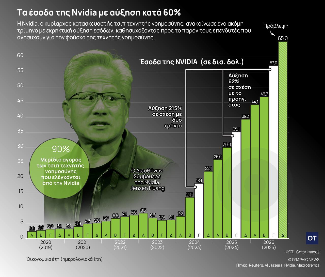 Η Nvidia, η εταιρεία που κυριαρχεί στην κατασκευή τσιπ που χρησιμοποιούνται σε εφαρμογές τεχνητής νοημοσύνης, ανακοίνωσε ένα ακόμη τρίμηνο με εκρηκτική αύξηση των εσόδων, καθησυχάζοντας προς το παρόν τους επενδυτές που ανησυχούν ότι η φούσκα της τεχνητής νοημοσύνης ενδέχεται, κάποια στιγμή, να σκάσει.