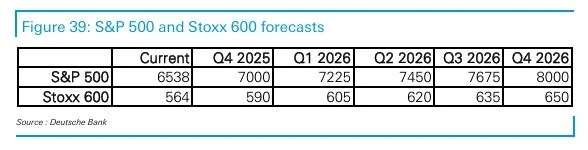 «Ταύρος» είναι η Deutsche Bank για το 2026, καθώς η τιμή-στόχος των 8.000 μονάδων που δίνει για τον S&P 500 προβλέπει περιθώρια ανόδου της τάξης του 17% για τη Wall Street. Εξίσου αισιόδοξος εμφανίζεται ο επενδυτικός οίκος και για τις ευρωπαϊκές αγορές, με την τιμή-στόχο των 650 μονάδων για τον Stoxx 600 να διαμορφώνεται τουλάχιστον 13% υψηλότερα από τα τρέχοντα επίπεδα.
