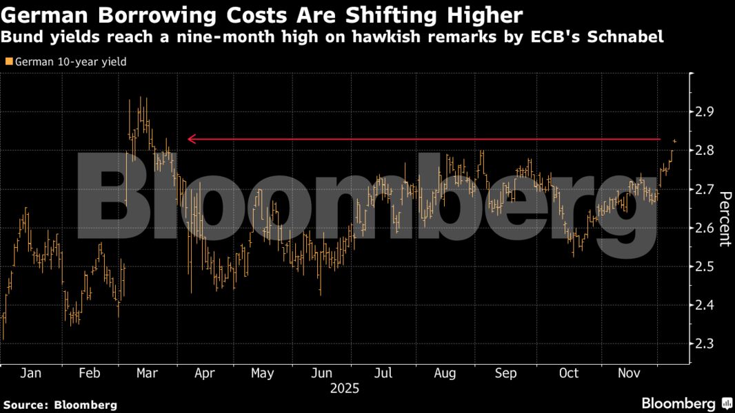 «Οι αποδόσεις των Bund αγγίζουν κρίσιμα επίπεδα, κάτι που ενισχύθηκε από τις δηλώσεις της Σνάμπελ σήμερα το πρωί», έγραψε ο στρατηγικός αναλυτής της Commerzbank, Χάουκε Ζιμσεν, σε σημείωμάτους προς πελάτες. Τα γερμανικά ομόλογα υστερούν έναντι των διεθνών ομολόγων από τότε που η γερμανική κυβέρνηση παρουσίασε το ιστορικό της σχέδιο για την αξιοποίηση εκατοντάδων δισεκατομμυρίων ευρώ σε άμυνα και υποδομές — εξέλιξη που προκάλεσε τον εντονότερο «sell-off» ομολόγων των τελευταίων 35 ετών τον Μάρτιο. Παρότι η κατάσταση εξομαλύνθηκε τους επόμενους μήνες, οι ανησυχίες επέστρεψαν μετά την έγκριση του προϋπολογισμού του 2026, που περιλαμβάνει 98 δισ. ευρώ καθαρό νέο ομοσπονδιακό δανεισμό.