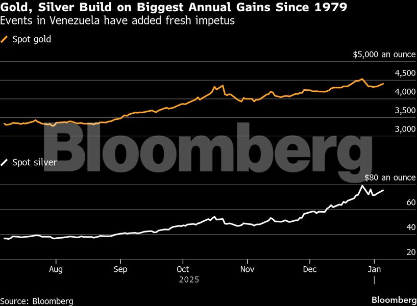 Η τιμή spot του χρυσού ενισχύθηκε έως και 2,1% τη Δευτέρα, ξεπερνώντας τα 4.420 δολάρια ανά ουγγιά, ενώ το ασήμι ενισχύθηκε σχεδόν κατά 5%. Ο Πρόεδρος των Ηνωμένων Πολιτειών Ντόναλντ Τραμπ δήλωσε ότι οι ΗΠΑ σκοπεύουν να «διοικούν» τη Βενεζουέλα μετά την ανατροπή του Μαδούρο το Σαββατοκύριακο, αφήνοντας αβέβαιο το μέλλον της διακυβέρνησης της χώρας της Νότιας Αμερικής. Τόνισε ότι η Ουάσιγκτον χρειάζεται «πλήρη πρόσβαση» στη χώρα, συμπεριλαμβανομένων των πετρελαϊκών της αποθεμάτων.