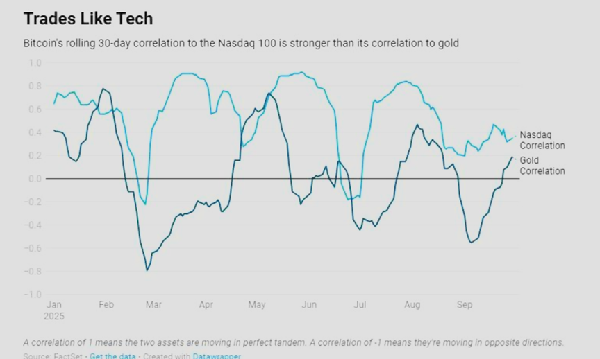 Παρά ταύτα, οι αγορές δεν ενδιαφέρονται για τις ιστορικές αναλογίες. Το bitcoin διαπραγματεύεται σαν να ακολουθεί το διάγραμμα των μετοχών της Tesla, ενώ ο χρυσός παραμένει σταθερός ως χρηματοοικονομικό ασφαλές καταφύγιο.