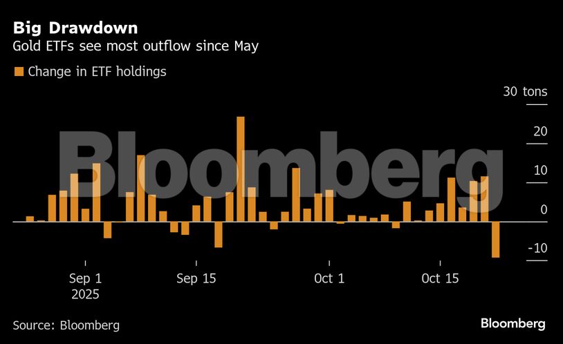 Το πολύτιμο μέταλλο υποχώρησε λόγω μιας τεχνικής αναπροσαρμογής που επιδεινώθηκε από την έξοδο των επενδυτών από τα διαπραγματεύσιμα αμοιβαία κεφάλαια (ETF). Η ημερήσια εκροή από τα ETF που υποστηρίζονται από χρυσό την Τετάρτη ήταν η μεγαλύτερη των τελευταίων πέντε μηνών, σύμφωνα με στοιχεία που συγκέντρωσε το Bloomberg.