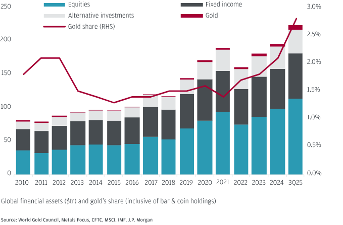 Στα τέλη Σεπτεμβρίου, ο χρυσός αντιστοιχούσε περίπου στο 2,8% του συνόλου των περιουσιακών στοιχείων υπό διαχείριση (AUM) παγκοσμίως. Παρότι το ποσοστό αυτό έχει αυξηθεί κατά περίπου μία ποσοστιαία μονάδα τα τελευταία δύο χρόνια, η JP Morgan θεωρεί ότι μπορεί να φτάσει το 4%–5% τα επόμενα χρόνια.