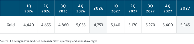 Σύμφωνα με την ανάλυση της JP Morgan Global Research, η μέση τιμή του χρυσού αναμένεται να διαμορφωθεί στα 5.055 δολάρια ανά ουγγιά το τέταρτο τρίμηνο του 2026, ενώ η ανοδική πορεία εκτιμάται ότι θα συνεχιστεί έως τα 5.400 δολάρια ανά ουγγιά μέχρι το τέλος του 2027.