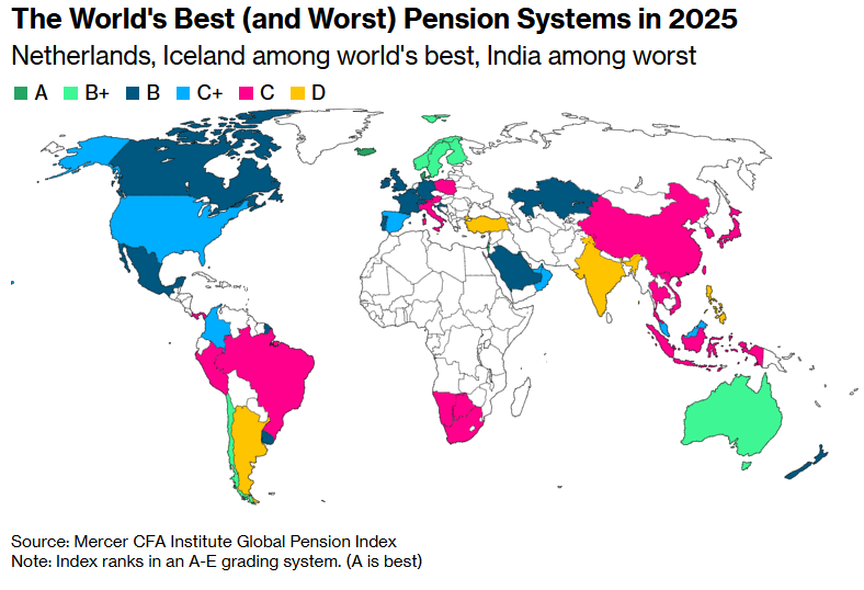 Ακολουθεί σχετικός χάρτης με τα καλύτερα και τα χειρότερα συνταξιοδοτικά συστήματα στον κόσμο το 2025: