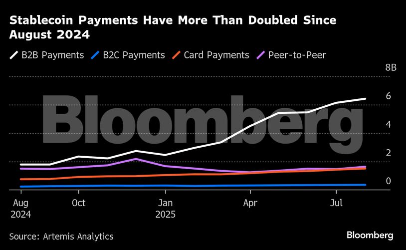 Σύμφωνα με στοιχεία του Artemis, παρόχου δεδομένων blockchain, περισσότερα από 10 δισ. δολάρια διακινήθηκαν μέσω stablecoins τον Αύγουστο για πληρωμές αγαθών, υπηρεσιών και εμβασμάτων — ποσό αρκετά αυξημένο από τα 6 δισ. δολάρια του Φεβρουαρίου και υπερδιπλάσιο σε σχέση με τον Αύγουστο του 2024. Με αυτόν τον ρυθμό, οι πληρωμές μέσω stablecoin θα μπορούσαν να αγγίξουν τα 122 δισ. δολάρια ετησίως, εκτιμούν οι ερευνητές του Artemis.