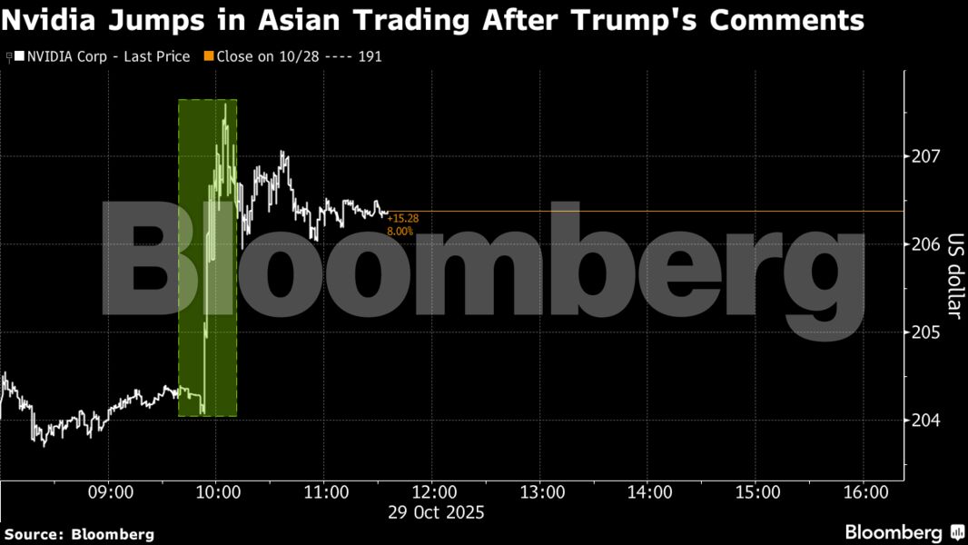 Οι μετοχές της Nvidia σημείωσαν άνοδο 8,5% στην εναλλακτική πλατφόρμα Blue Ocean. Τα σχόλια του Τραμπ ήρθαν να προστεθούν στην προηγούμενη άνοδο 6,8% που προήλθε από μια σειρά εξελίξεων που υπογράμμισαν αυξανόμενη αισιοδοξία γύρω από την παγκόσμια άνθηση των υποδομών τεχνητής νοημοσύνης. Πρόκειται για κέρδη που ξεπέρασαν ακόμη και τις υψηλές προσδοκίες, τις αισιόδοξες προβλέψεις της Nvidia για τη ζήτηση τσιπ και μια σειρά συμφωνιών που ανακοίνωσε η εταιρεία κατά τη διάρκεια μιας σημαντικής διάσκεψης στην Ουάσιγκτον αυτή την εβδομάδα.
