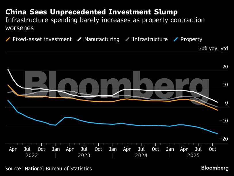 Η οικονομική δραστηριότητα της Κίνας επιβραδύνθηκε περισσότερο από το αναμενόμενο στην αρχή του τέταρτου τριμήνου, με μια άνευ προηγουμένου πτώση των επενδύσεων και επιβράδυνση της ανάπτυξης της βιομηχανικής παραγωγής να προστίθενται στην επιβράδυνση της κατανάλωσης.