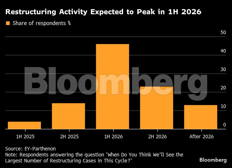 Σχεδόν οι μισοί από τους αναλυτές που συμμετείχαν στην έρευνα αναμένουν κορύφωση στις περιπτώσεις εταιρικής αναδιάρθρωσης το α’ εξάμηνο του 2026. Αυτό σηματοδοτεί μια σημαντική αλλαγή σε σχέση με την έκθεση της EY-Parthenon του Μαρτίου, όταν η πλειοψηφία των τραπεζιτών προέβλεπε ότι η δραστηριότητα θα κορυφωθεί πριν από το τέλος του 2025.