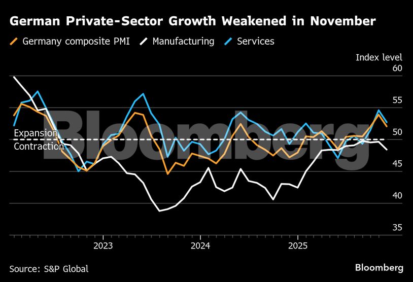 Ο βιομηχανικός κλάδος παραμένει η μεγαλύτερη εστία προβληματισμού. Η Γερμανία βρίσκεται αντιμέτωπη με τους δασμούς των ΗΠΑ και τον αυξανόμενο ανταγωνισμό από την Κίνα, με αποτέλεσμα η μεταποίηση να υποχωρήσει ξανά κάτω από το κρίσιμο όριο των 50 μονάδων. Ο δείκτης PMI του κλάδου «έπεσε» στις 48,4 μονάδες τον Νοέμβριο, μετά από μικρή ανάκαμψη τους προηγούμενους μήνες.