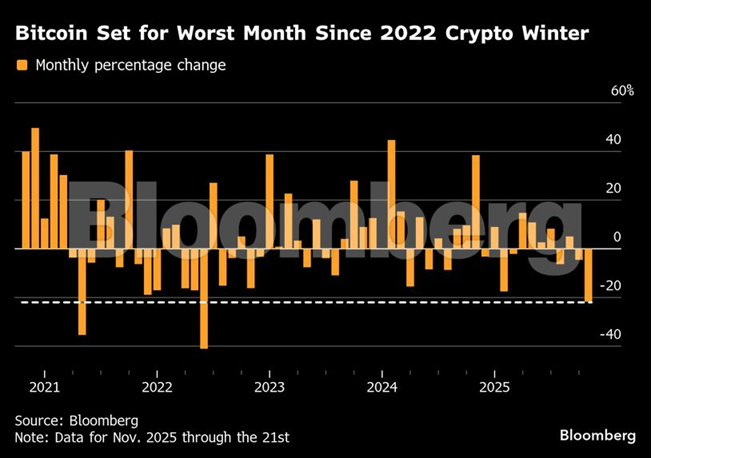 Μόνο μέσα στον Νοέμβριο, το Bitcoin έχει χάσει περίπου το 25% της αξίας του, στη μεγαλύτερη μηνιαία πτώση από τον Ιούνιο του 2022, όταν το stablecoin TerraUSD του Ντο Κουόν κατέρρευσε, ξεκινώντας ένα ντόμινο εταιρικών πτωχεύσεων που κορυφώθηκε με τη χρεοκοπία του ανταλλακτηρίου FTX του Σαμ Μπάνκμαν-Φριντ.
