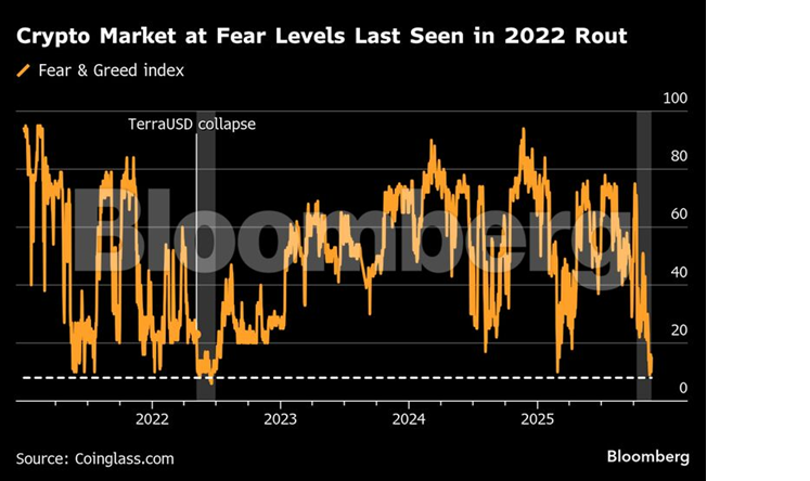 Ο δείκτης επενδυτικού κλίματος της CoinGlass, που μετρά τη μεταβλητότητα, τις ροές και την εσωτερική δυναμική της αγοράς, βρίσκεται στα χαμηλότερα επίπεδα από το κραχ του 2022 και αποτυπώνει κλίμα «ακραίου φόβου» (extreme fear). Αξίζει να σημειωθεί ότι αμέσως μετά τη νίκη Τραμπ στις εκλογές πριν από έναν χρόνο, ο δείκτης βρισκόταν στο εντυπωσιακό 94, το οποίο μοιάζει πλέον μακρινό.