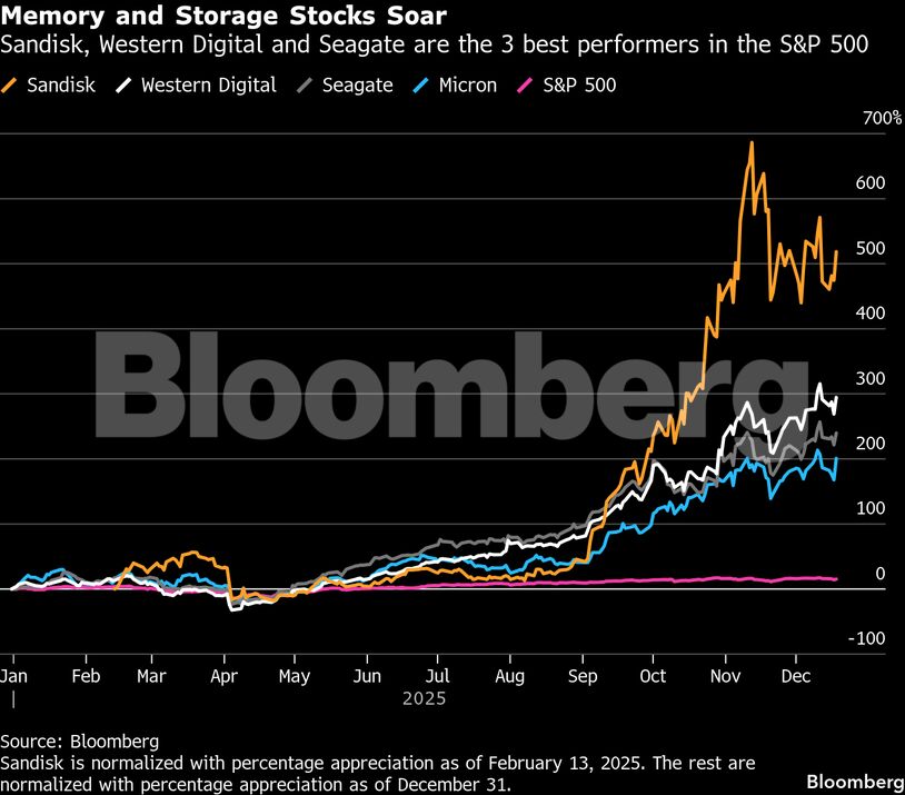 Οι επενδυτές ανακάλυψαν νέες συναλλαγές AI το 2025, παρακολουθώντας πού πηγαίνουν τα δισεκατομμύρια δολάρια σε δεσμευμένες κεφαλαιουχικές δαπάνες, κάτι το οποίο είναι εμφανές αν κοιτάξει κανείς τις εταιρείες με τις καλύτερες επιδόσεις στον δείκτη S&P 500. Η εταιρεία μνήμης και αποθήκευσης Sandisk Corp. βρίσκεται στην κορυφή της λίστας, ακολουθούμενη από την Western Digital Corp και την Seagate Technology Holdings Plc. Η Micron Technology Inc., βρίσκεται στην πέμπτη θέση.
