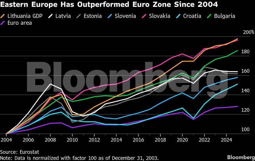 Και ενώ ο αριθμός των ανατολικών μελών της Ευρωζώνης έχει αυξηθεί, το οικονομικό τους βάρος παραμένει πιο μέτριο. Μαζί, οι επτά χώρες της περιοχής που ανήκουν στο νομισματικό μπλοκ αντιπροσωπεύουν λιγότερο από το 4% του ΑΕΠ, σε σύγκριση με περισσότερο από το 70% για τη Γερμανία, τη Γαλλία, την Ιταλία και την Ισπανία συνολικά.