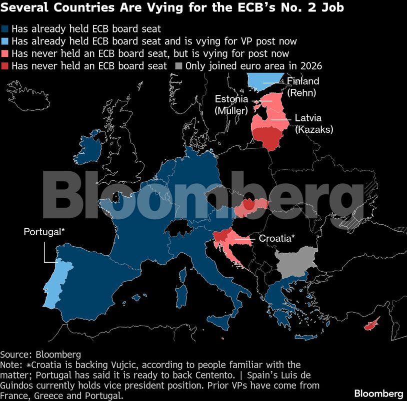 Υποψήφιοι από την Εσθονία, τη Λετονία και την Κροατία διεκδικούν τη θέση του αντιπροέδρου Ντε Γκίντος, ο οποίος αποχωρεί τον Μάιο. Ακόμη και αν δεν επιτύχουν, μέχρι το τέλος του 2027 θα υπάρχουν άλλες τρεις κενές θέσεις στο εξαμελές Εκτελεστικό Συμβούλιο.