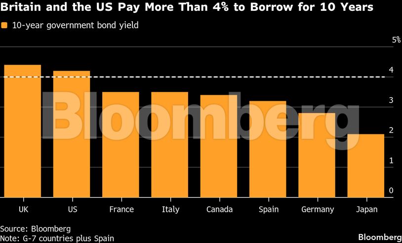 Η απόδοση του 10ετούς ομολόγου αναφοράς στο Ηνωμένο Βασίλειο παραμένει πάνω από 4%, μετά την απότομη άνοδο τον περασμένο Ιούλιο, ένα επεισόδιο που θυμίζει την κατάρρευση της αγοράς ομολόγων το 2022, η οποία κόστισε τη θέση της πρώην πρωθυπουργού Λιζ Τρας. Το αντίστοιχο επιτόκιο στις ΗΠΑ είναι ελάχιστα χαμηλότερο. Η Γαλλία, εν τω μεταξύ, έχει από τις υψηλότερες αποδόσεις στην Ευρωζώνη, έχοντας υποβαθμιστεί η πιστοληπτική της ικανότητα από τους S&P Global και Fitch, μεταξύ άλλων, εν μέσω του αδιεξόδου στον προϋπολογισμό.