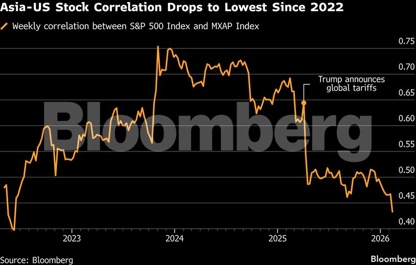 Ως αποτέλεσμα, οι συσχετίσεις μεταξύ των ασιατικών και των αμερικανικών μετοχών με βάση τις εβδομαδιαίες αποδόσεις έχουν μειωθεί στο 0,43, το χαμηλότερο επίπεδο από τον Ιούνιο του 2022, σύμφωνα με στοιχεία που συγκέντρωσε το Bloomberg.
