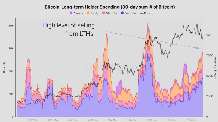 Η πίεση αυξάνεται καθώς οι μακροπρόθεσμοι επενδυτές — που ορίζονται ευρέως από τον κλάδο ως εκείνοι που κατείχαν bitcoin για πάνω από 155 ημέρες — επιτάχυναν τις πωλήσεις τους, σύμφωνα με αναλυτές της εταιρείας ανάλυσης κρυπτονομισμάτων CryptoQuant.