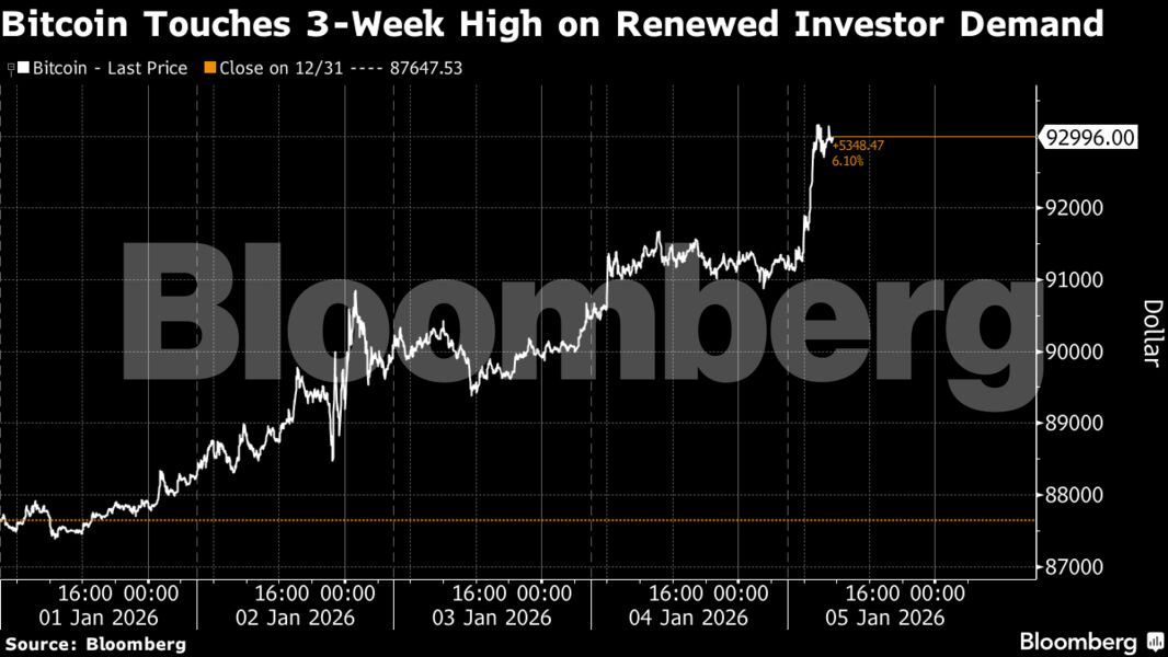 Σε υψηλό τριών εβδομάδων σκαρφάλωσε το Bitcoin κατά τις πρωινές συναλλαγές στην Ασία, καθώς συνεχίζεται το κλίμα πολιτικής αβεβαιότητας μετά την κίνηση των ΗΠΑ να απομακρύνουν τον πρόεδρο της Βενεζουέλας, Νικολάς Μαδούρο, το περασμένο Σαββατοκύριακο.