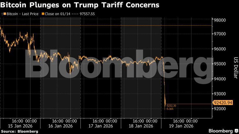 Ισχυρές πιέσεις δέχθηκαν τα κρυπτονομίσματα, καθώς το κλίμα αποστροφής κινδύνου ενισχύθηκε μετά την ανακοίνωση του Ντόναλντ Τραμπ για νέους δασμούς σε οκτώ ευρωπαϊκές χώρες. Το bitcoin υποχώρησε έως και 3,6% τις πρωινές ώρες της Δευτέρας, πέφτοντας κάτω από τα 92.000 δολάρια, ενώ ακόμη μεγαλύτερες απώλειες κατέγραψαν άλλα ψηφιακά νομίσματα.