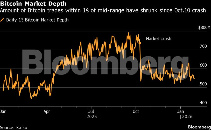 Το βάθος της αγοράς του Bitcoin — δηλαδή το διαθέσιμο κεφάλαιο για την απορρόφηση μεγάλων συναλλαγών — παραμένει πάνω από 30% χαμηλότερο από το υψηλό του Οκτωβρίου, σύμφωνα με στοιχεία της Kaiko. Η τελευταία φορά που η ρευστότητα είχε υποχωρήσει τόσο ήταν μετά την κατάρρευση της FTX το 2022.