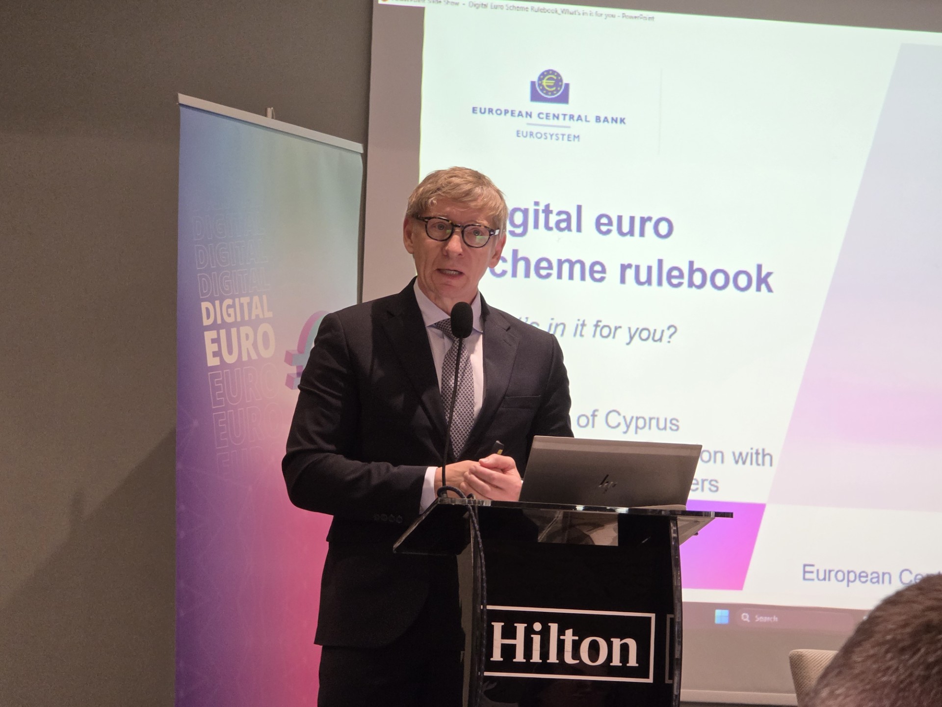 Ειδικότερα, αναφέρθηκε στα κριτήρια επιλεξιμότητας, την διαδικασία ένταξης στο σχήμα, τις απορρέουσες υποχρεώσεις, τους όρους και τις προϋποθέσεις για τερματισμό ή αναστολή της συμμετοχής, καθώς και τις διαδικασίες που ενεργοποιούνται σε περίπτωση παραβίασης. Η αναθεωρημένη εκδοχή του προσχεδίου του εγχειριδίου κανόνων παραδόθηκε στην Ομάδα Ανάπτυξης του Εγχειριδίου, διευκρινίστηκε ότι αυτό είναι επαρκώς ευέλικτο ώστε να μπορεί να προσαρμοστεί σε αλλαγές που ενδέχεται να προκύψουν από τις νομοθετικές συζητήσεις σχετικά με το προσχέδιο του κανονισμού για το ψηφιακό ευρώ. Παρουσιάστηκαν επίσης τα προσχέδια των ελάχιστων προτύπων εμπειρίας χρήστη, ενδεικτικά σενάρια χρήσης και ολοκληρωμένες ροές διαδικασιών. Ο κ. Papsdorf υπογράμμισε προς την κυπριακή αγορά ότι η συμμόρφωση με το εγχειρίδιο κανόνων θα διασφαλίσει μία τυποποιημένη, ασφαλή και υψηλής ποιότητας εμπειρία χρήστη για όλα τα εμπλεκόμενα μέρη, ενώ παράλληλα θα ενισχύσει την καινοτομία και τον ανταγωνισμό σε ολόκληρη την ευρωζώνη.