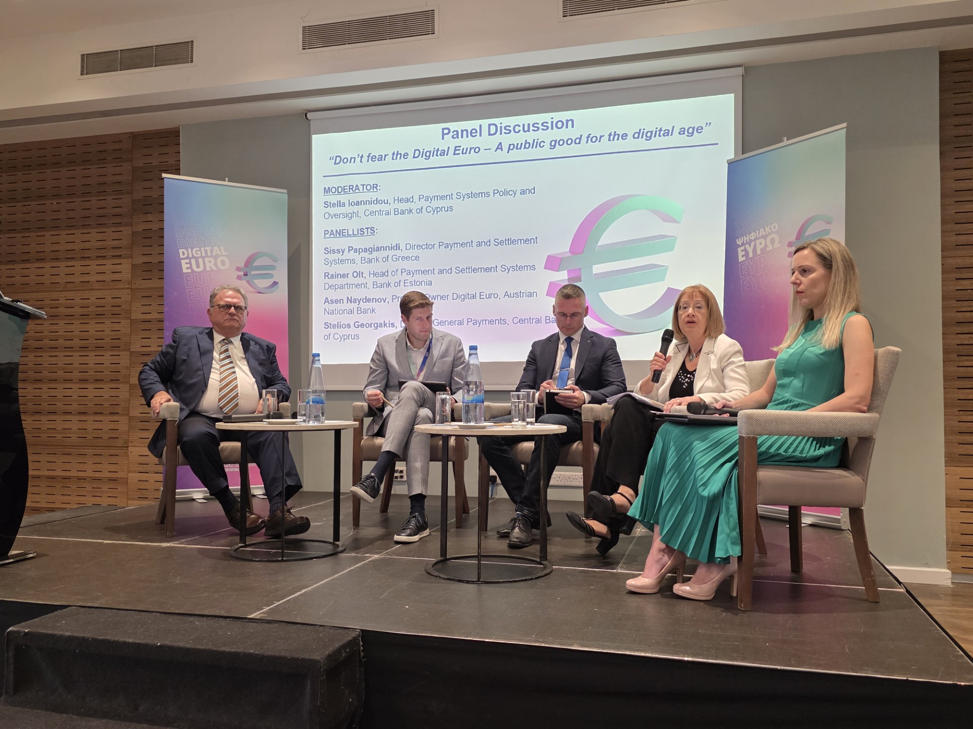 Αξίζει να γίνει ιδιαίτερη αναφορά στην συζήτηση στρογγυλής τραπέζης που ακολούθησε, όπου συμμετείχαν εκλεκτά στελέχη από τις Κεντρικές Τράπεζες της Ελλάδας, της Εσθονίας, της Αυστρίας και της Κύπρου. Συγκεκριμένα, η κα. Σίσσυ Παπαγιαννίδου, ο κ. Rainer Olt, ο κ. Asen Naydenov, και ο κ. Στέλιος Γιωργάκης εξέτασαν μία σειρά θεμάτων που αφορούν στο κόστος, στις επιπτώσεις δικτύου όπου η αξία και η χρησιμότητα ενός συστήματος πληρωμών αυξάνονται καθώς περισσότεροι χρήστες εντάσσονται σε αυτό, στους εκτιμώμενους κινδύνους, στην ανθεκτικότητα και στoν δρόμο προς την ετοιμότητα της αγοράς για υιοθέτηση του ψηφιακού ευρώ. Αυτά τα θέματα δεν είναι σημαντικά μόνο από τεχνική άποψη αλλά έχουν στρατηγική σημασία για το μέλλον της Ευρώπης.