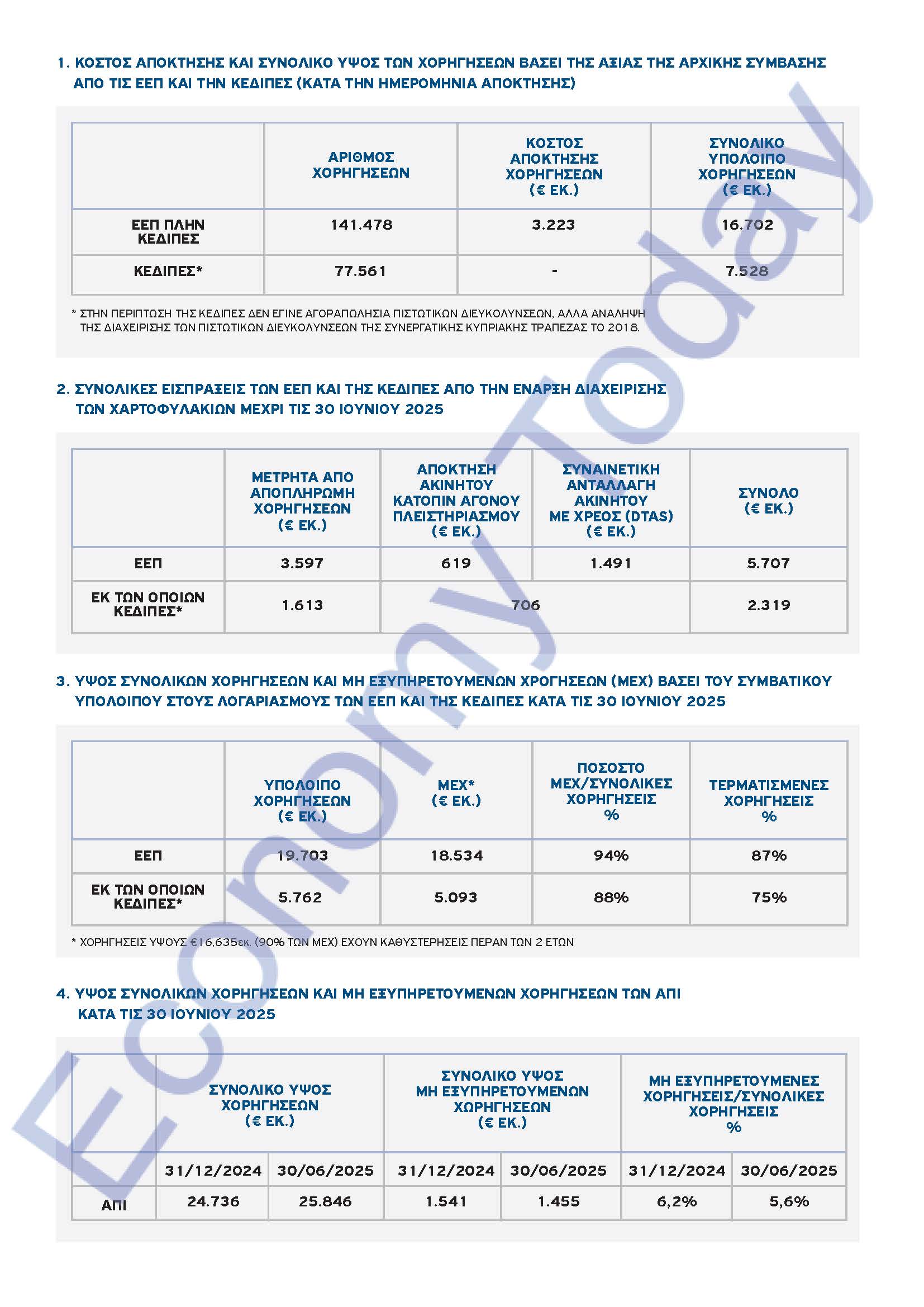 Μέχρι τις 30 Ιουνίου 2025, οι συνολικές εισπράξεις των ΕΕΠ ανήλθαν σε €5,707 δισ., ποσό που περιλαμβάνει και €2,319 δισ. που αφορούν την ΚΕΔΙΠΕΣ. Όσον αφορά τις ΕΕΠ, τα €3,597 δισ. προήλθαν από αποπληρωμές σε μετρητά, €619 εκατ. από πλειστηριασμούς και €1,491 δισ. από συναινετικές ανταλλαγές ακινήτων έναντι χρέους (DTAs). Αντιστοίχως για την ΚΕΔΙΠΕΣ τα €1,613 δις προήλθαν από αποπληρωμές σε μετρητά, τα €706 εκατ. από πλειστηριασμούς και DTAs,
