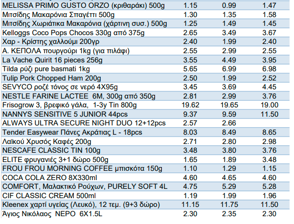 Με βάση τους δείκτες τιμών για το μήνα Οκτώβριο, σε σύνολο 45 κατηγοριών βασικών προϊόντων, 28 κατηγορίες κατέγραψαν μείωση, εκ των οποίων 14 κατηγορίες σε ποσοστό πέραν του 1%. Τη μεγαλύτερη μείωση κατέγραψαν τα φρέσκα ψάρια και μαλάκια κατά 17,4% και τα λαχανικά/χόρτα κατά 13,4%, ακολουθούμενα από τα ζυμαρικά κατά 4,1%, τα κατεψυγμένα ψάρια και κρέατα σε ποσοστό 3,8% και 3,5% αντίστοιχα, το εμφιαλωμένο νερό κατά 1,8%, το αλεύρι κατά 1,6% και η ζάχαρη κατά 1%.