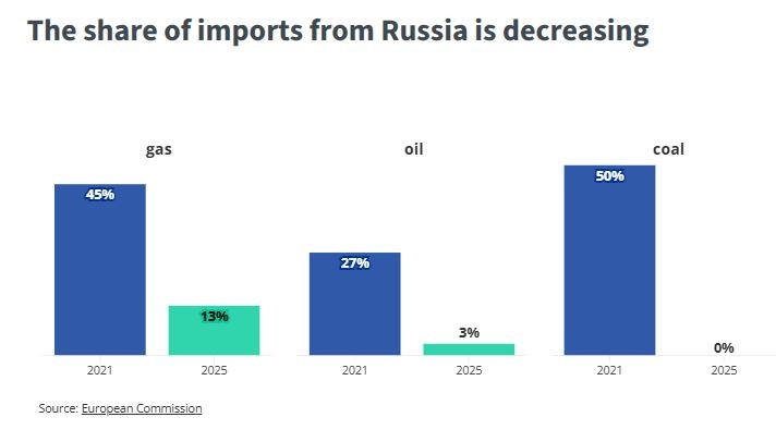 Πριν από τον πόλεμο στην Ουκρανία, η Ρωσία κάλυπτε πάνω από το 40% των αναγκών της ΕΕ σε φυσικό αέριο. Το ποσοστό αυτό έχει περιοριστεί περίπου στο 13% το 2025, σύμφωνα με τα πιο πρόσφατα διαθέσιμα στοιχεία της Ευρωπαϊκής Ένωσης.