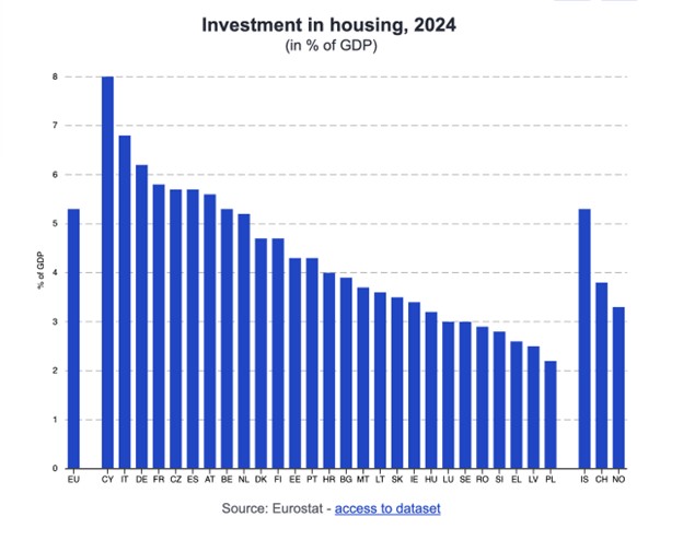 Σε ευρωπαϊκό επίπεδο, η οικοδομική δραστηριότητα παραμένει αυξημένη. Μεταξύ 2010 και 2024, οι οικοδομικές άδειες για κατοικίες αυξήθηκαν κατά 5%, ενώ οι επενδύσεις στη στέγαση έφτασαν το 5,3% του ΑΕΠ στην ΕΕ. Η Κύπρος καταγράφει ακόμη υψηλότερο ποσοστό, με επενδύσεις που αγγίζουν το 8% του ΑΕΠ.