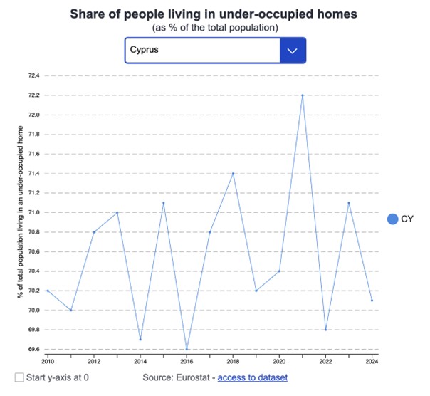 Ωστόσο, η ίδια πηγή αποκαλύπτει μια λιγότερο συζητημένη πτυχή της αγοράς: το 70% των κατοικιών στην Κύπρο χαρακτηρίζονται ως υποκατοικημένες, το υψηλότερο ποσοστό στην ΕΕ.
