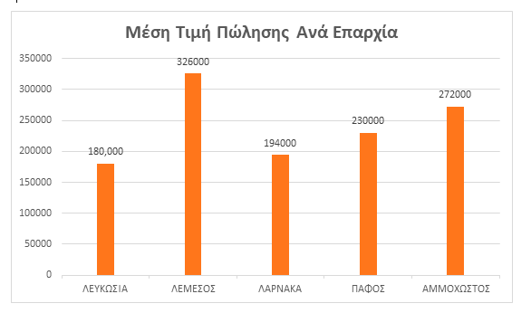 Ιδιαίτερο ενδιαφέρον παρουσιάζουν τα στοιχεία που αφορούν στις μέσες τιμές πώλησης ακινήτων ανά επαρχία. Η Λευκωσία έχει τη χαμηλότερη μέση τιμή πώλησης με €180.000, αρκετά πιο πίσω από την επαρχία Λεμεσού, όπου η μέση αξία πώλησης ανέρχεται στις €326.000. Η μέση τιμή στην επαρχία Λευκωσίας είναι μειωμένη -1,2% σε σύγκριση με την αντίστοιχη περσινή περίοδο, εν αντιθέσει με τη Λεμεσό όπου η μέση τιμή είναι αυξημένη κατά 11,5%.