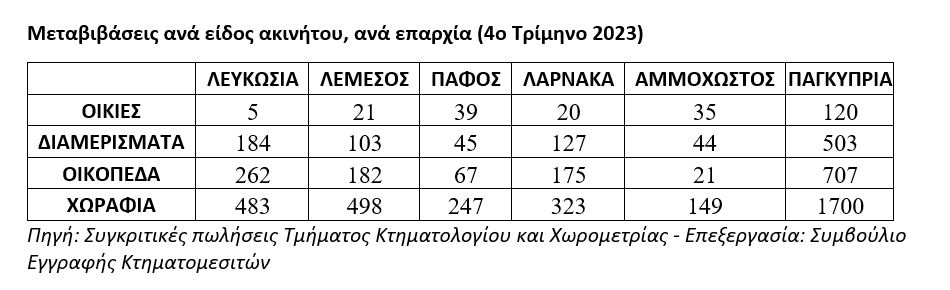 Σύμφωνα με τις συγκριτικές πωλήσεις ακινήτων του Τμήματος Κτηματολογίου και Χωρομετρίας, τις οποίες επεξεργάζεται και παρουσιάζει στο τριμηνιαίο του «Ενημερωτικό Δελτίο για την αγορά Ακινήτων» το Συμβούλιο Εγγραφής Κτηματομεσιτών, το τέταρτο τρίμηνο του έτους ολοκληρώθηκαν 3534 μεταβιβάσεις αξίας €517,3 εκατ. και κατατέθηκαν 2907 πωλητήρια έγγραφα αξίας €913,6 εκατ.