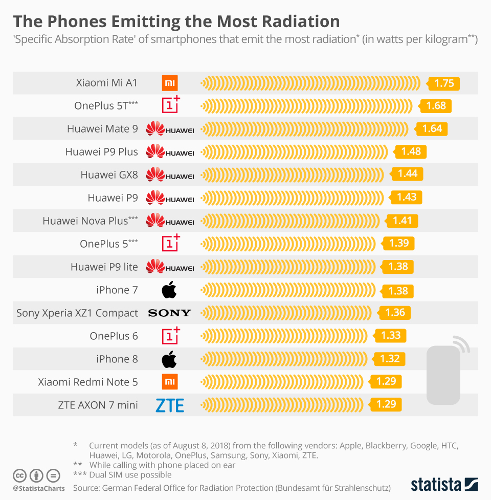 Βάσει αυτών των δεδομένων (αλλά και άλλων σχετικών πηγών), το Statista σχεδίασε το infographic που ακολουθεί παρουσιάζοντας τα κινητά τηλέφωνα που εκπέμπουν την μεγαλύτερη ακτινοβολία τη στιγμή που τα ακουμπάμε στο αυτί μας για να μιλήσουμε.