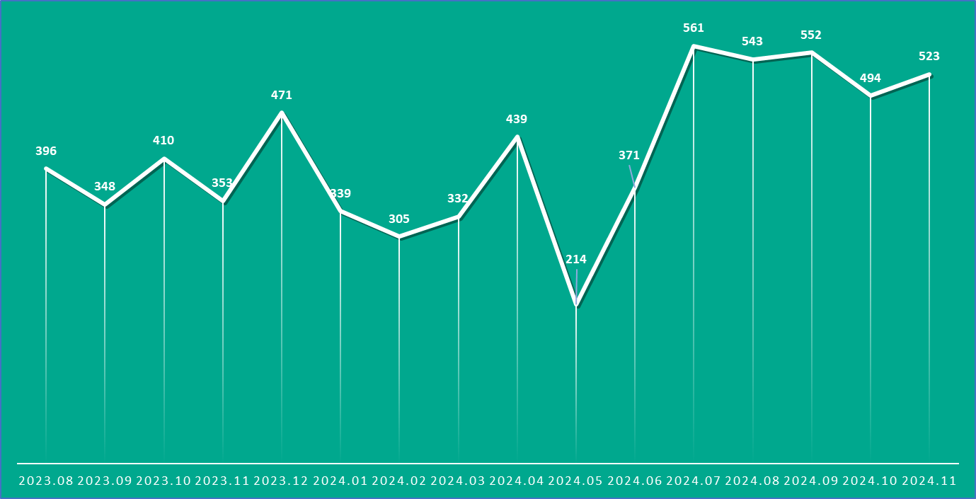 Ο αριθμός των δημοσιεύσεων στο dark web για την αγοραπωλησία βάσεων δεδομένων. Ένα από τα δημοφιλή φόρουμ, Αύγουστος 2023 – Νοέμβριος 2024. Πηγή: Kaspersky Digital Footprint Intelligence.