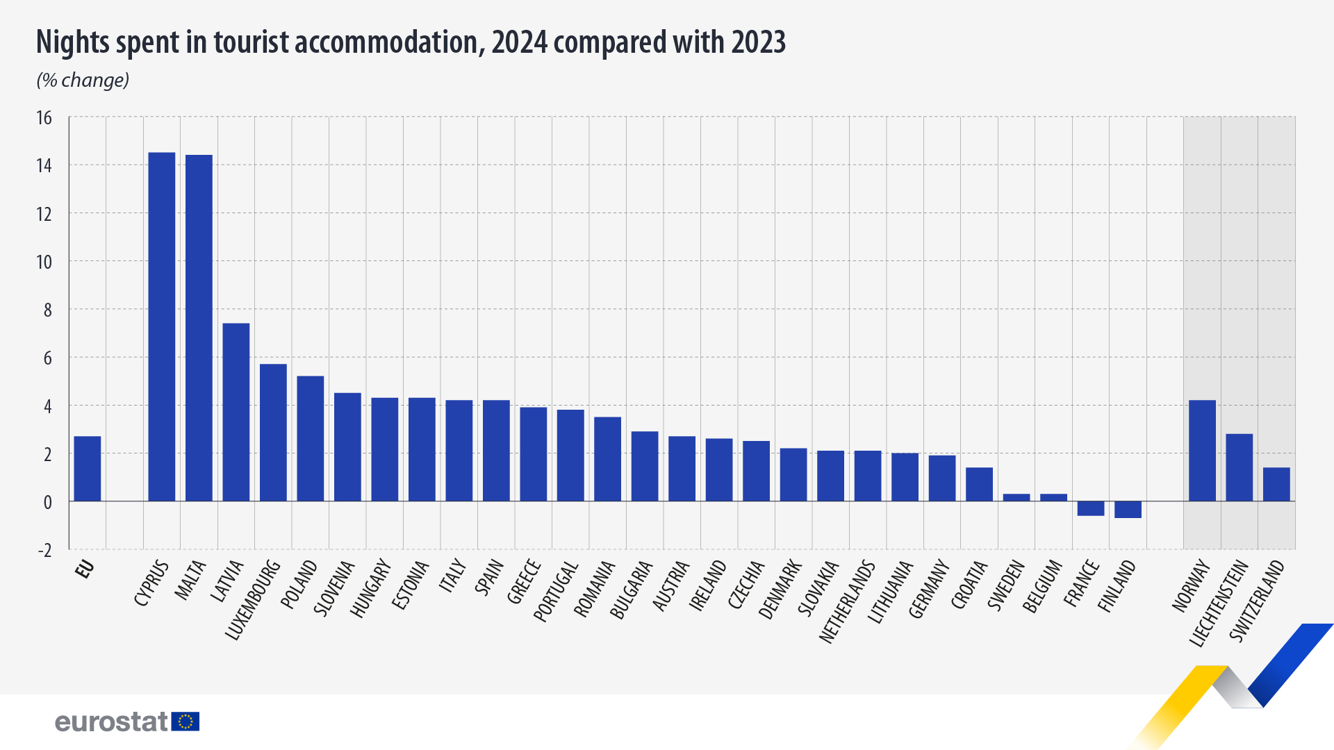 Μεταξύ των χωρών της ΕΕ, η Κύπρος και η Μάλτα κατέγραψαν την υψηλότερη ετήσια αύξηση στις τουριστικές νύχτες, με αυξήσεις 14,5% και 14,4%, αντίστοιχα. Η Λετονία ακολούθησε με απόσταση, σημειώνοντας ρυθμό ανάπτυξης 7,4% σε σύγκριση με το 2023.