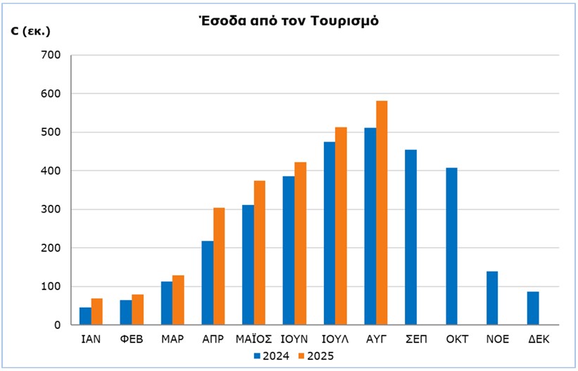 Σύμφωνα με στοιχεία που δημοσίευσε σήμερα η Στατιστική Υπηρεσία, τα έσοδα από τον τουρισμό τον Αύγουστο 2025 ανήλθαν σε €581,8 εκατ., σημειώνοντας αύξηση 13,8% σε σχέση με τον αντίστοιχο μήνα του 2024. Για το οκτάμηνο Ιανουαρίου - Αυγούστου, τα συνολικά έσοδα ανήλθαν σε €2,47 δισ., αυξημένα κατά 16,5%.