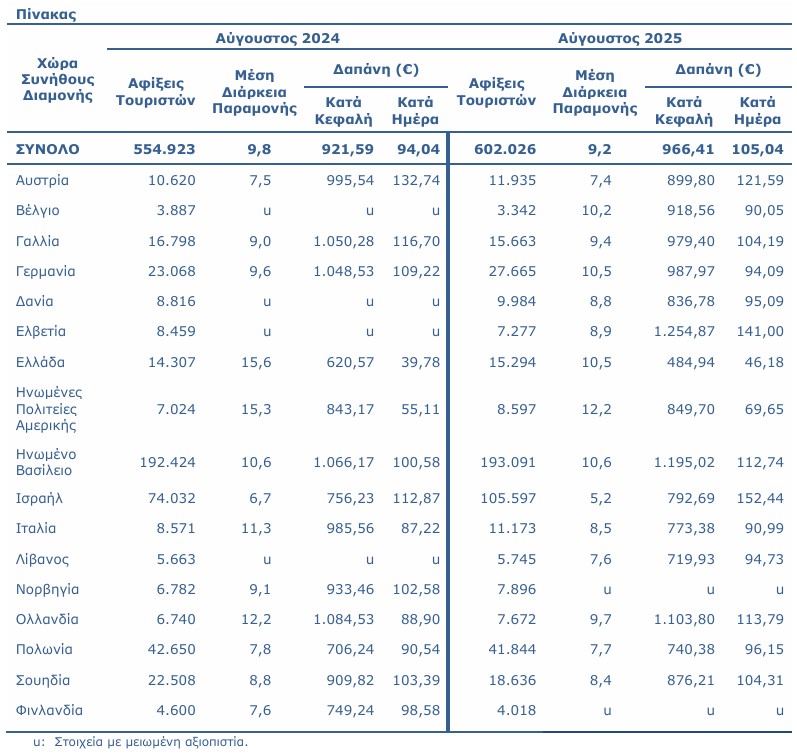 H κατά κεφαλή δαπάνη τουριστών τον Αύγουστο 2025 ανέρχεται σε €966,41 σε σύγκριση με €921,59 τον Αύγουστο 2024, σημειώνοντας αύξηση 4,9%. Οι Βρετανοί τουρίστες (η μεγαλύτερη τουριστική αγορά με 32,1% του συνόλου των τουριστών τον Αύγουστο 2025) ξόδεψαν κατά μέσο όρο €112,74 ημερησίως, ενώ οι Ισραηλινοί τουρίστες (η δεύτερη μεγαλύτερη τουριστική αγορά κατά τον συγκεκριμένο μήνα με 17,5% του συνόλου) ξόδεψαν κατά μέσο όρο €152,44. Οι τουρίστες από την Πολωνία (τρίτη μεγαλύτερη αγορά με 7,0%), ξόδεψαν €96,15 ημερησίως.
