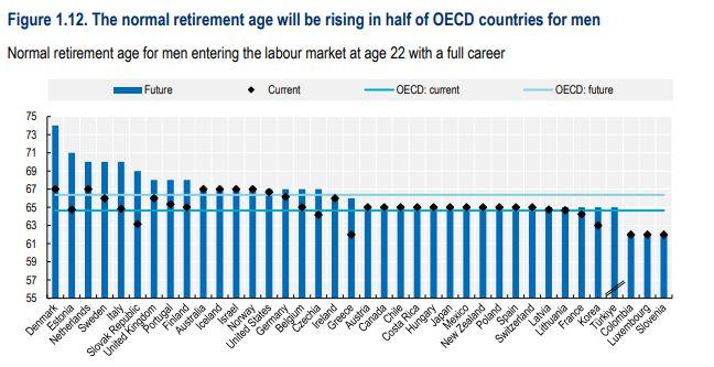 Η χώρας μας επίσης έχει από τις χαμηλότερες ηλικίες κανονικής συνταξιοδότησης, καθώς η κανονική ηλικία συνταξιοδότησης είναι 62 έτη, από τις χαμηλότερες στον ΟΟΣΑ (μαζί με Κολομβία, Λουξεμβούργο, Σλοβενία). Η πρόβλεψη ωστόσο για τα επόμενα χρόνια είναι ότι η μέση ηλικία συνταξιοδότησης θα αρχίσει να ανεβαίνει και στην Ελλάδα ως γενική τάση αύξησης των ορίων ηλικίας συνταξιοδότησης λόγω της σύνδεσής τους με το προσδόκιμο ζωής μετά τα 65.