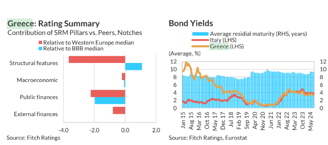 Η Fitch Ratings διατηρεί τη σύστασή της για το ελληνικό αξιόχρεο σε BBB-/Stable και τις εκτιμήσεις για την ανάπτυξη σε 2,3% για φέτος, 2,4% για το 2025 και 1,9% για το 2026. Ο οίκος εξηγεί ότι οι βασικοί παράγοντες αξιολόγησης της Ελλάδας αντικατοπτρίζουν τα επίπεδα του κατά κεφαλήν εισοδήματος και τους δείκτες διακυβέρνησης που είναι πολύ πάνω από το «ΒΒΒ», καθώς και την αξιοπιστία της πολιτικής που υποστηρίζεται από τη συμμετοχή στην ΕΕ και τη ζώνη του ευρώ.