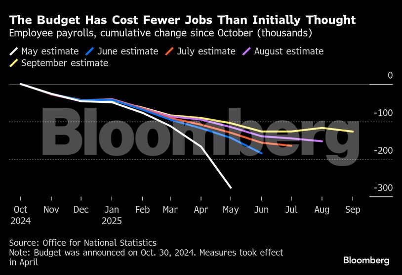 Σύμφωνα με την ONS, οι απασχολούμενοι σε μισθολόγιο μειώθηκαν κατά 10.000 τον Σεπτέμβριο, μετά από αντίστοιχη αύξηση 10.000 τον Αύγουστο, ενώ οι νέες θέσεις εργασίας μειώθηκαν μόλις κατά 9.000 στο τρίμηνο έως τον Σεπτέμβριο. Συνολικά, έχουν χαθεί 127.000 θέσεις από τον πρώτο προϋπολογισμό της υπουργού Οικονομικών Ρέιτσελ Ριβς τον Οκτώβριο του 2024 — πολύ λιγότερες από τις αρχικές εκτιμήσεις.